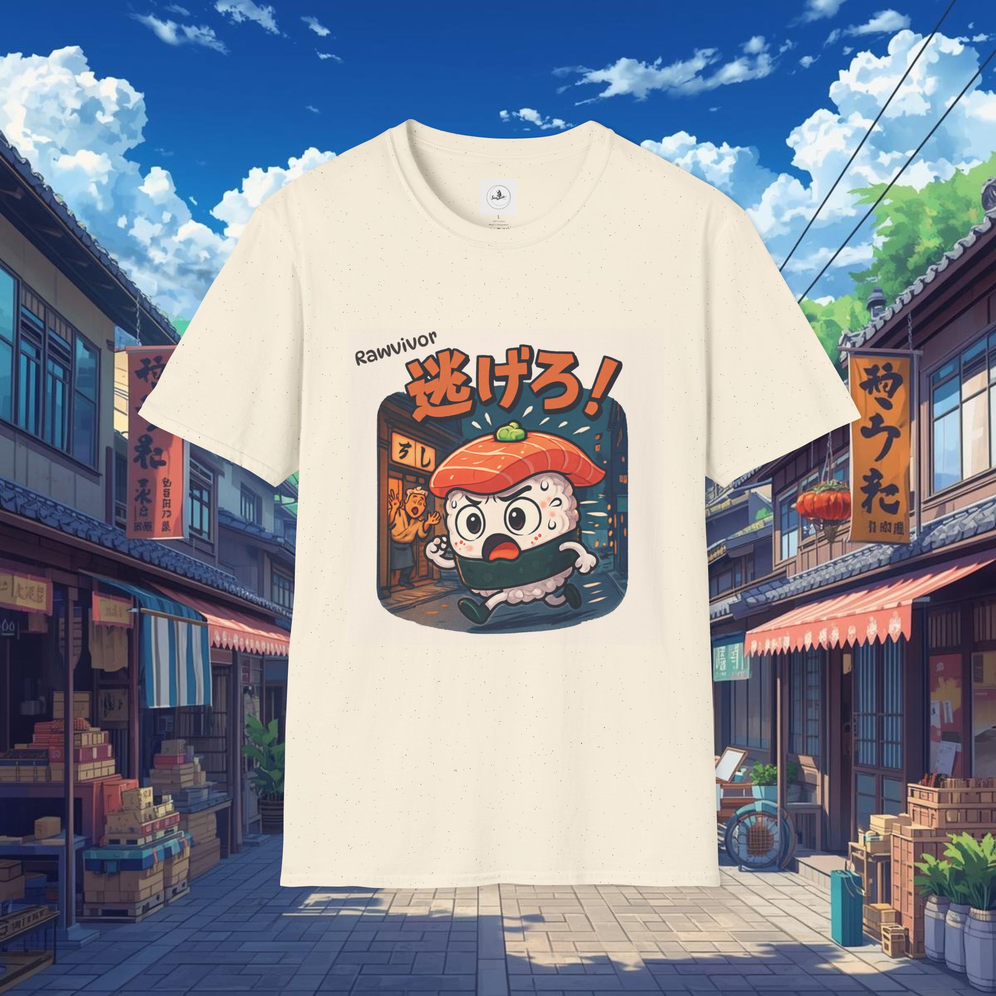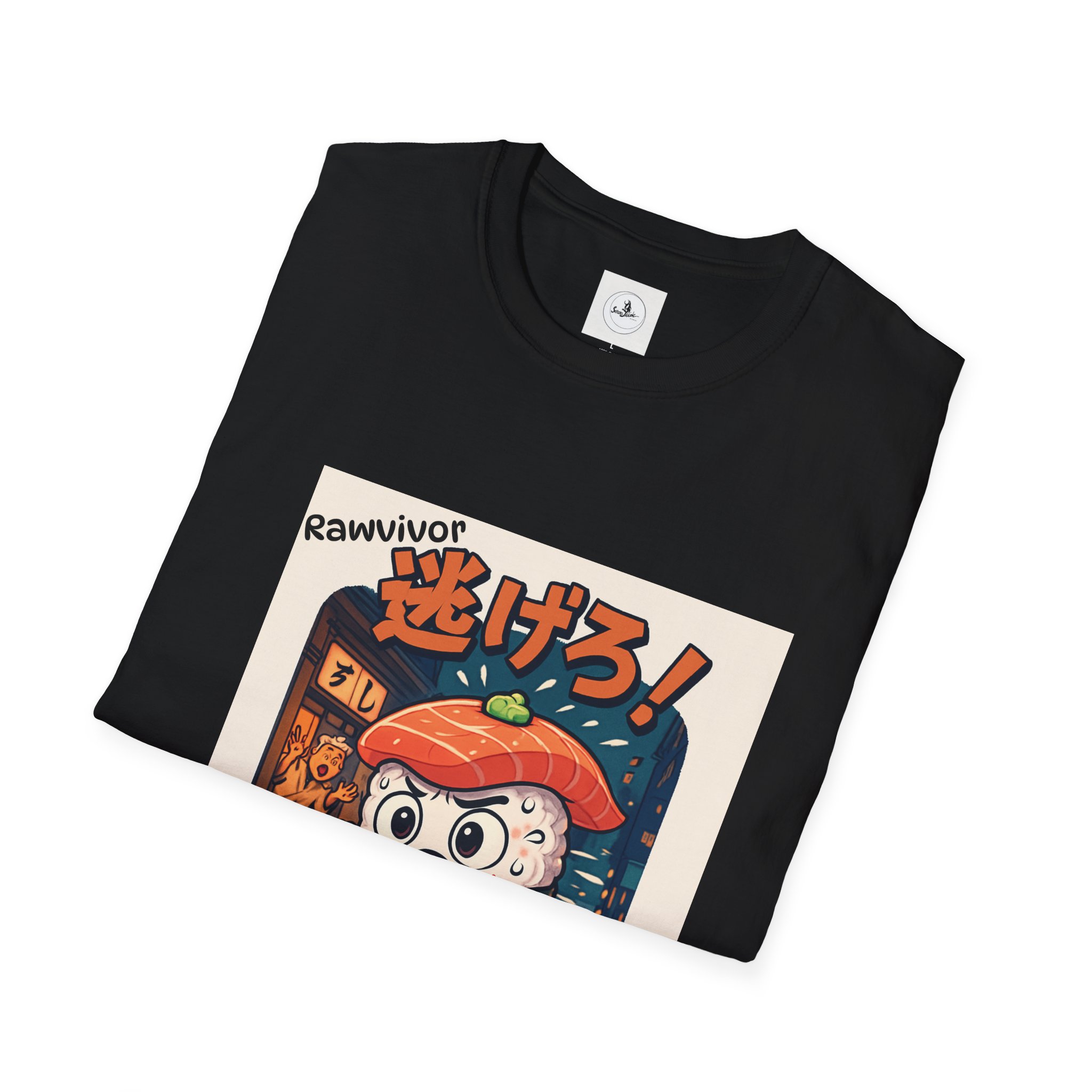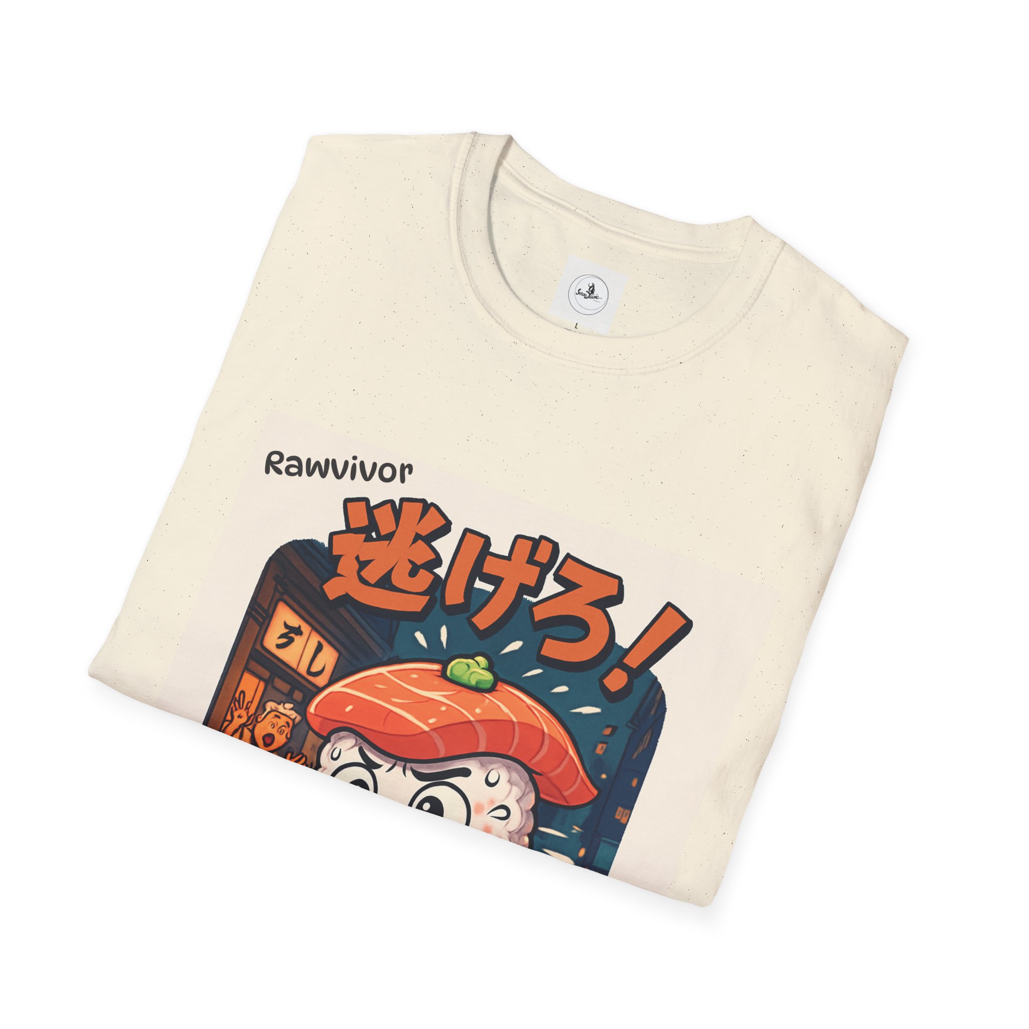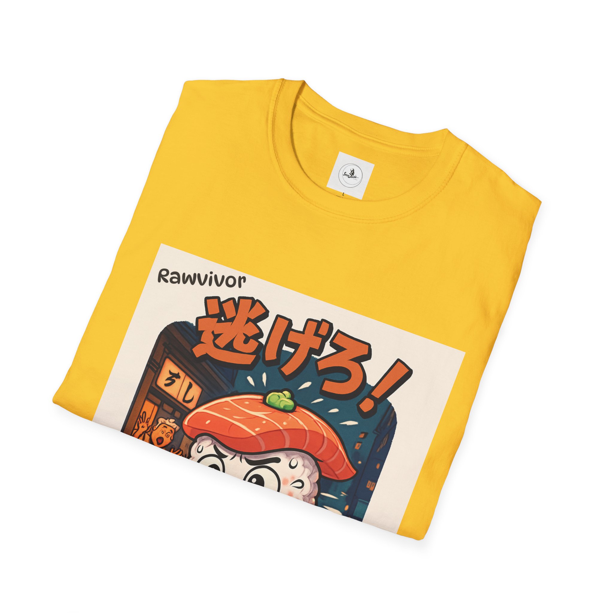 Daruma Sushi roll Escape Retro Anime T-Shirt – „Run!“ Japanese Streetwear