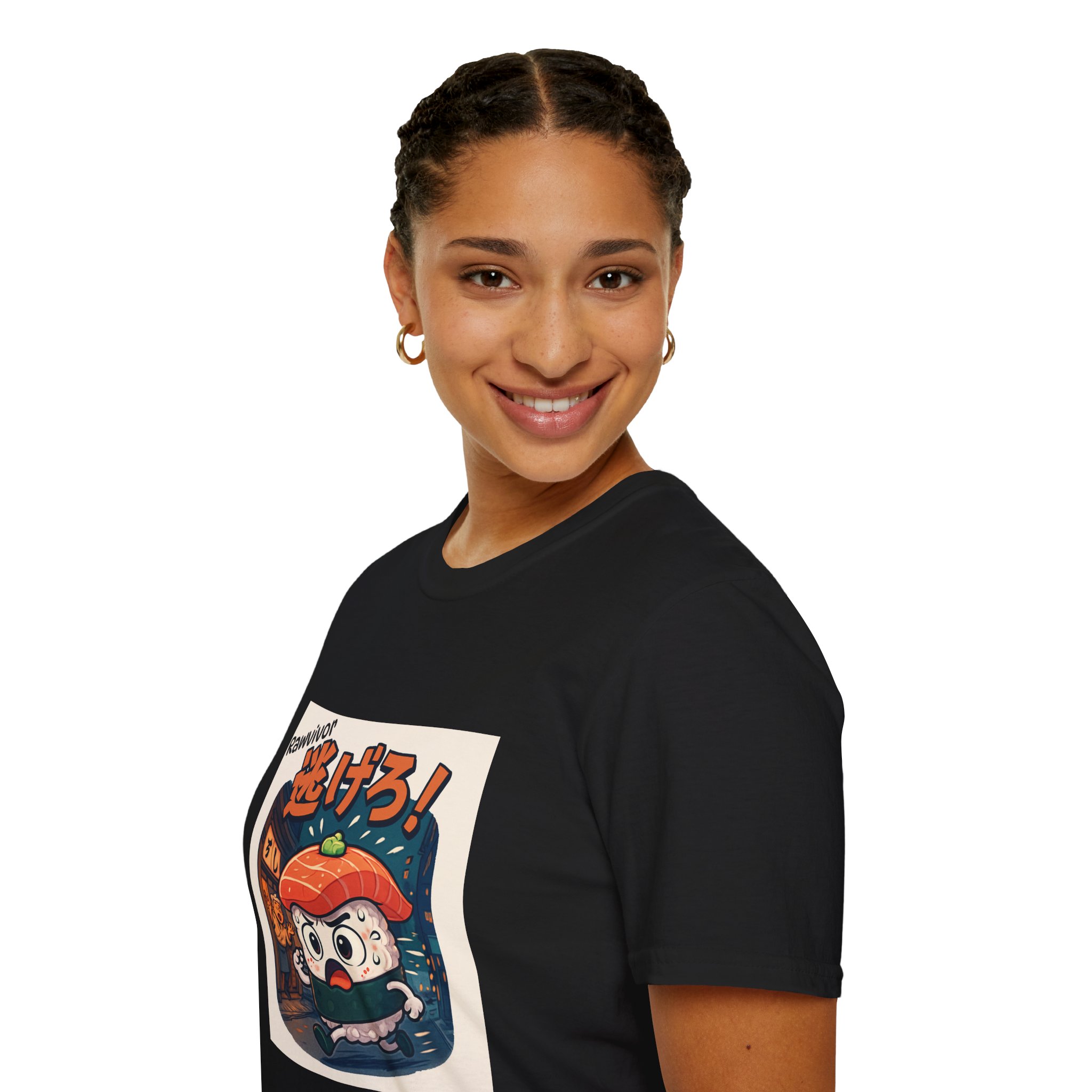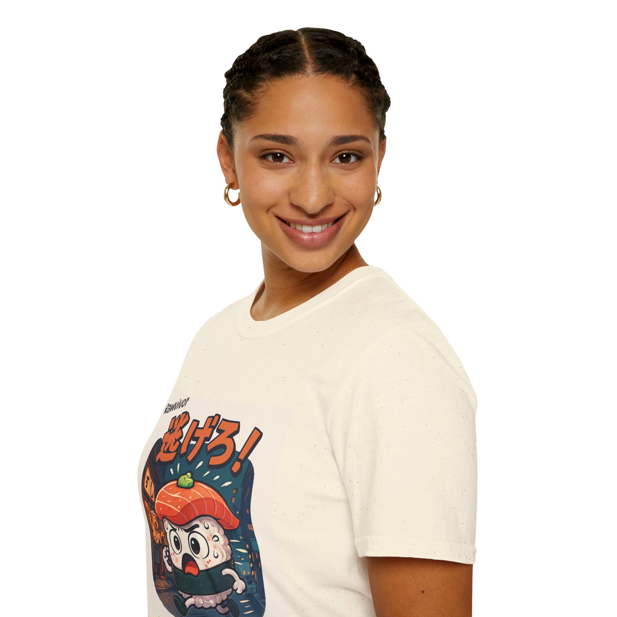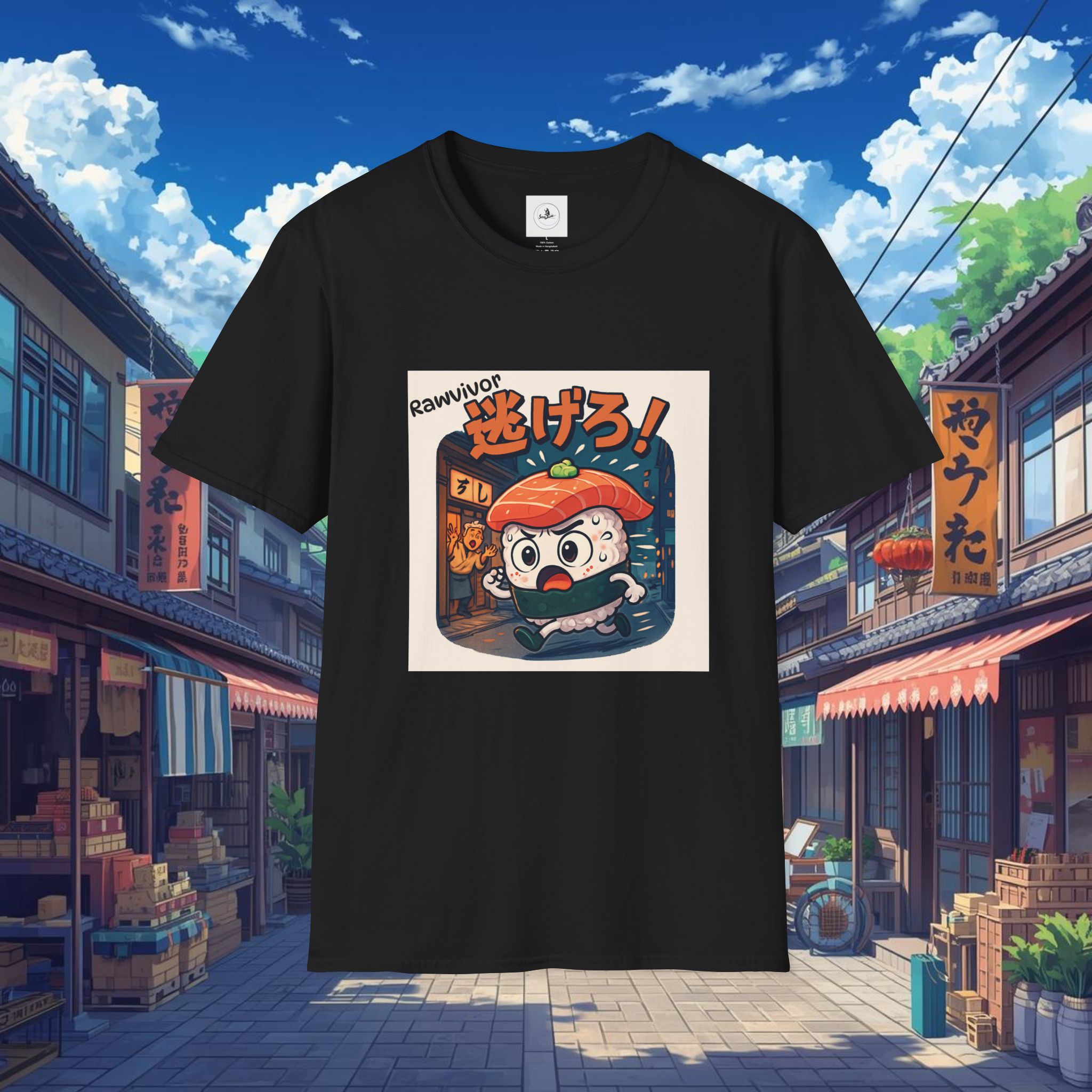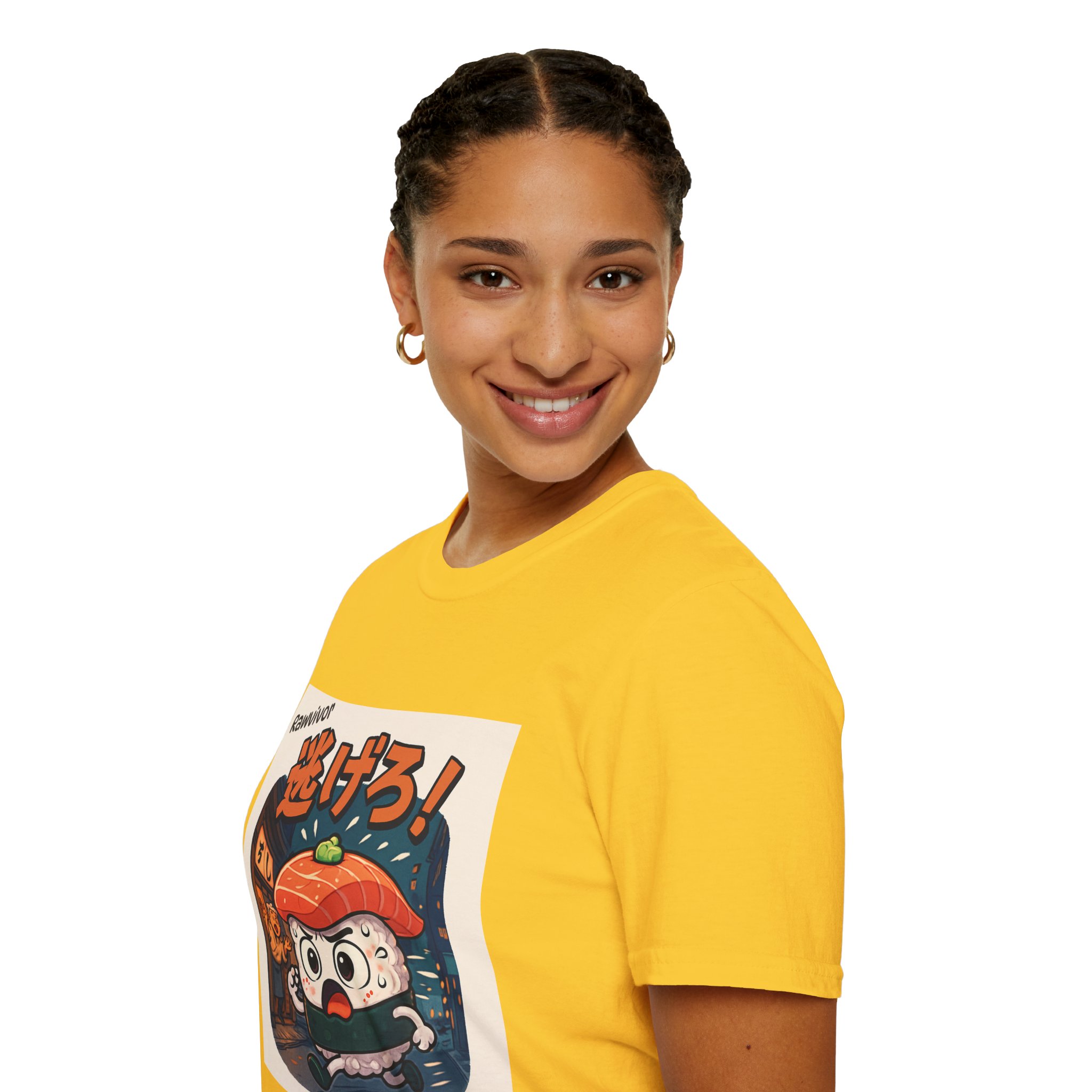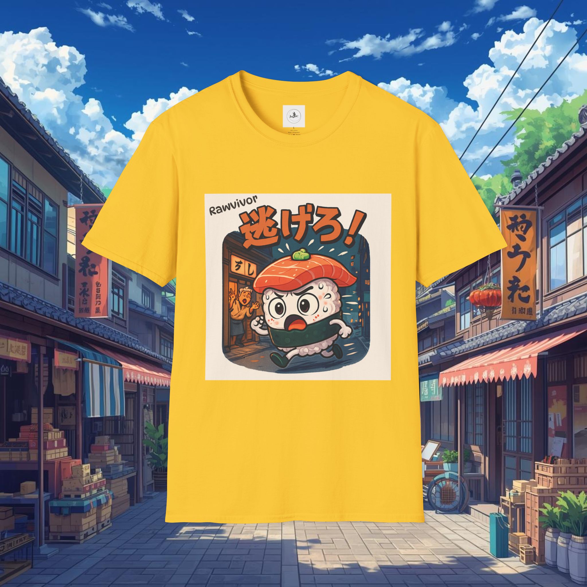 Daruma Sushi roll Escape Retro Anime T-Shirt – „Run!“ Japanese Streetwear